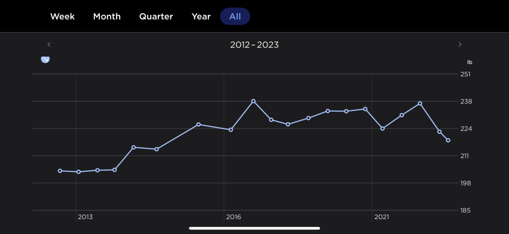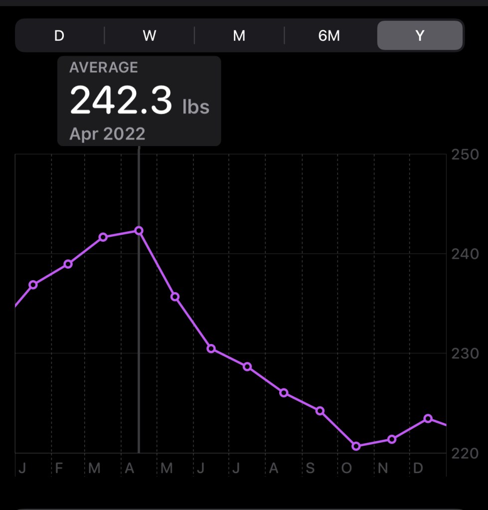 The first week of April 2021 I weighed an average of 224 (19lbs heavier than my solid run of 205lb 2012-14.) By the same period in 2022 I was up an average of another 20lbs, 244lbs. I hit the heaviest I’d ever been at 246 and change on a 6’1 frame. Something had to give. It wasn’t as if I hadn’t been trying between 2014 and 2022, with various diet attempts, various exercise regimes. However, nothing stuck. Even if the initial results were good.