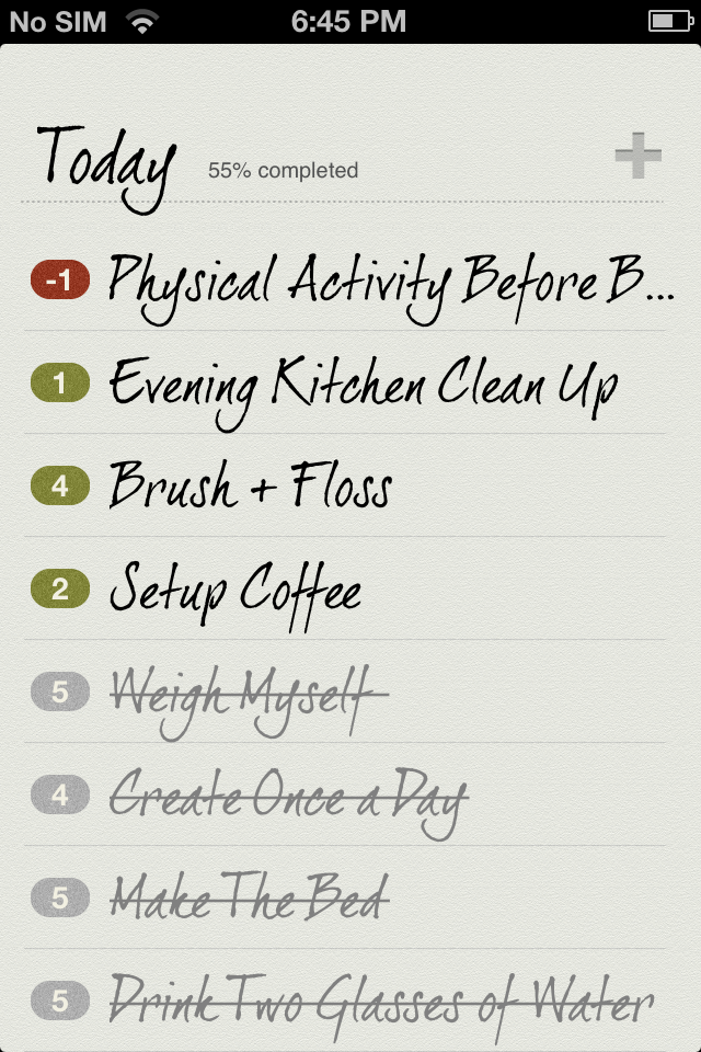 Habit List elegantly adds visual management to your recurring to-do list. Red dots along the left margin indicate you are not delivering on your commitments. Green dot’s mean you are doing well. The number centred in the dots indicate how many times you’ve either made or missed your commitment in the current streak.